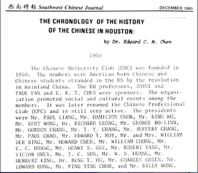 The Chinese University Club (CUC) was founded in 1950. The members were American born Chinese and Chinese students stranded in the US by the revolution in mainland China. The UH professors, JOYCE and PAUL FAN and E. K. T. CHEN were sponsors. The organization promoted social and cultural events among the members. It was later renamed the Chinese Professional Club (CPC) and is still very active. The presidents were Mr. PAUL LIANG, Mr. HAMILTON CHON, Mr. BING WU, Mr. KENT WONG, Dr. RICHARD LEONG, Mr. GEORGE BO-LINN, Mr. GORDON CHANG, Mr. T. Y. CHANG, Mr. JEFFERY CHANG, Mr. PAUL CHAU, Mr. EDWARD Y. MOY, Mr. and Mrs. WILLIAM DER BING, Mr. HOWARD CHEN, Mr. WILLIAM CHUNG, Mr. C. C. HUANG, Mr. HENRY S. GEE, Mr. ROBERT YANG, Mr. VICTOR HUEY, Mr. T. C. SUN, Mr. W. S. HUANG, Mr. HERBERT KING, Dr. BENG T. HO, Mr. CHARLES CHIEN, Mr. EDWARD HONG, Mr. PING YING CHOU, and Mr. BILLY WONG. (as of 1980)